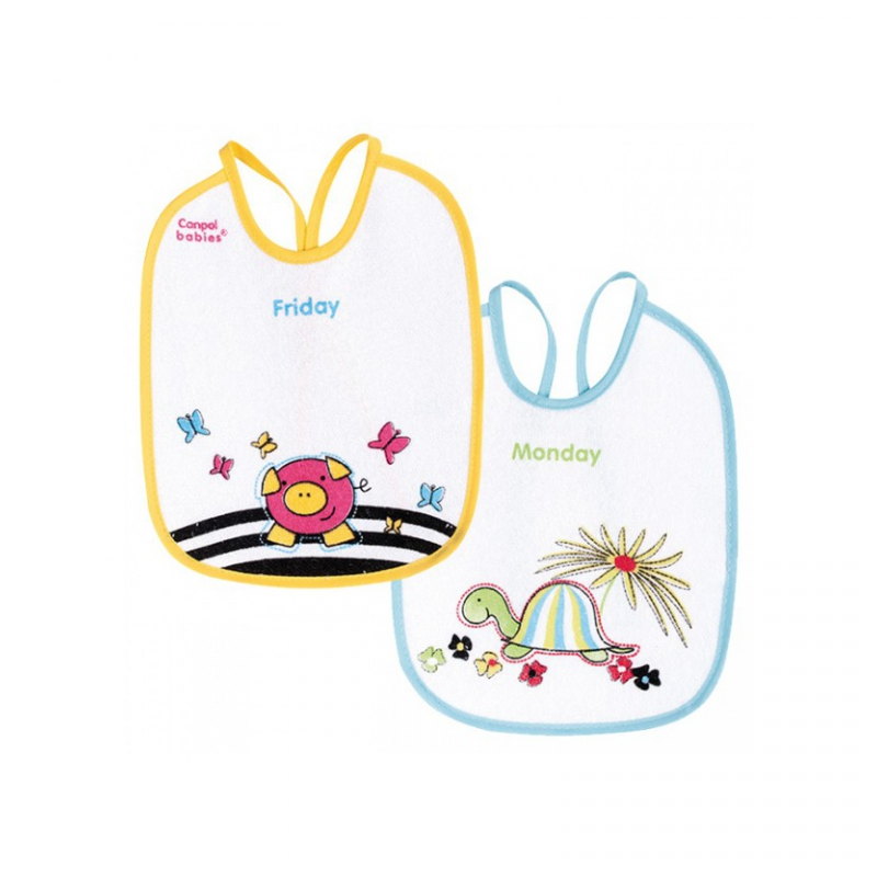 Praktické bryndáky vyrobené z bavlny a plastové fólie, která chrání oděv dítěte před ušpiněním. Dodávají se v několika barevných provedeních v balení po 7 kusech.