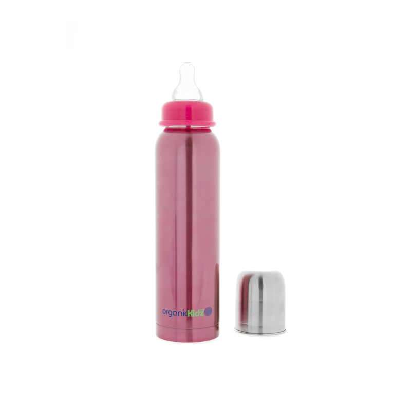 Nerozbitná termoizolační láhev OrganicKidz z nerezové oceli se silikonovou savičkou s rychlým průtokem (6+m). Vakuová izolace pomáhá udržet teplotu tekutiny 5–6 hodin. Neobsahuje bisfenol, PVC ani ftaláty. Přirozeně odolná usazování bakterií. Kompatibilní s většinou silikonových saviček pro láhve s úzkým hrdlem. Víčko lze používat jako odměrku o objemu 60ml. Možno mýt v horním koši myčky, nevhodné do mikrovlnné trouby. Možno sterilizovat párou.