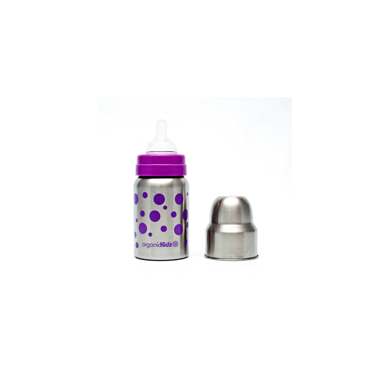 Nerozbitná láhev OrganicKidz z nerezové oceli se silikonovou savičkou s rychlým průtokem (6+m). Obsah láhve lze snadno ohřát v horké vodě. Neobsahuje bisfenol, PVC ani ftaláty. Přirozeně odolná usazování bakterií. Kompatibilní s většinou silikonových saviček pro láhve se širokým hrdlem. Víčko lze používat jako odměrku o objemu 60ml. Možno mýt v horním koši myčky, nevhodné do mikrovlnné trouby. Možno sterilizovat párou.