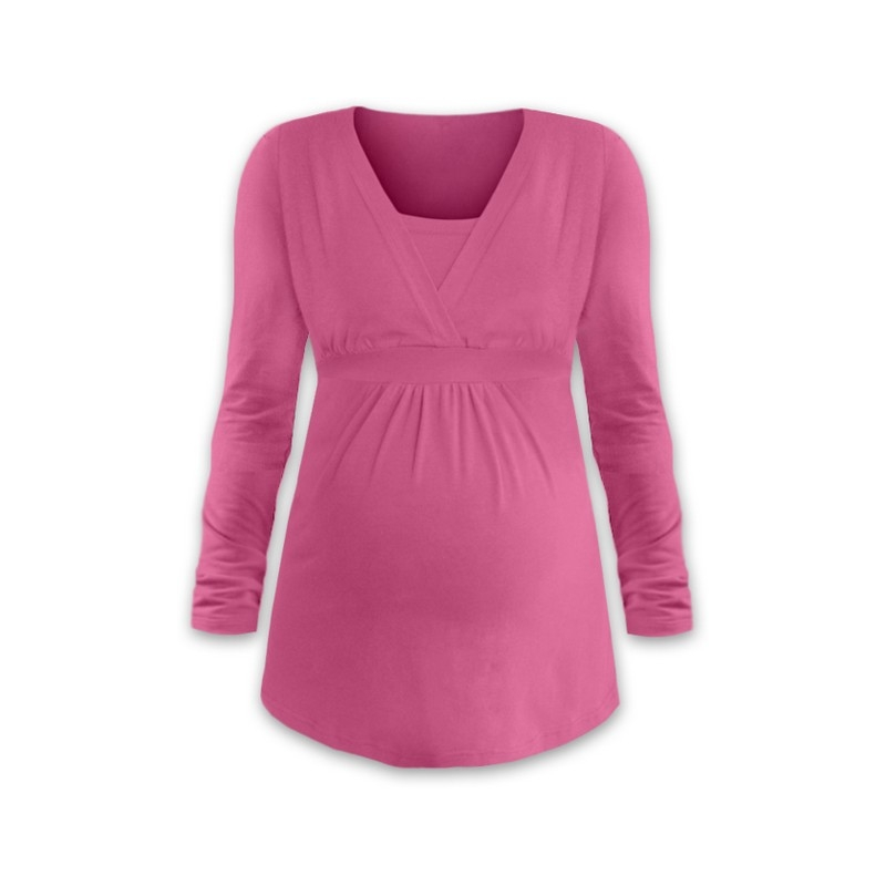 Tunika, dole rozšířená do "A", se vsadkou pro diskrétní a pohodlné kojení. Řasení nahoře na bříšku umožňuje velkou roztažnost tuniky i v těhotenství a po porodu skryje tento volný střih předního dílu bříško.