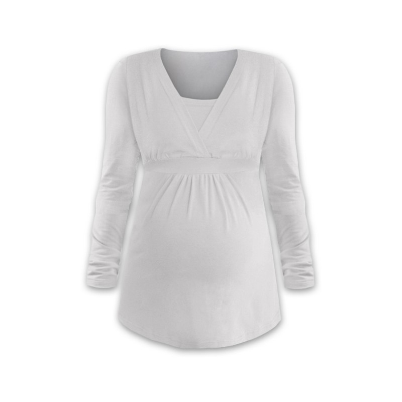 Tunika, dole rozšířená do "A", se vsadkou pro diskrétní a pohodlné kojení. Řasení nahoře na bříšku umožňuje velkou roztažnost tuniky i v těhotenství a po porodu skryje tento volný střih předního dílu bříško.