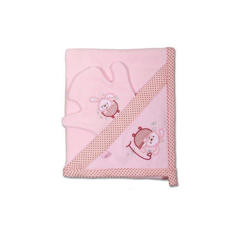 Osuška je dvouvrstvá, svrchní část je z měkoučkého fleecu a vnitřní část je vysoce savý froté materiál.S osuškou obdržíte i pomocníka při koupání- žínku ve stejné barvě a s vyšívaným obrázkem.