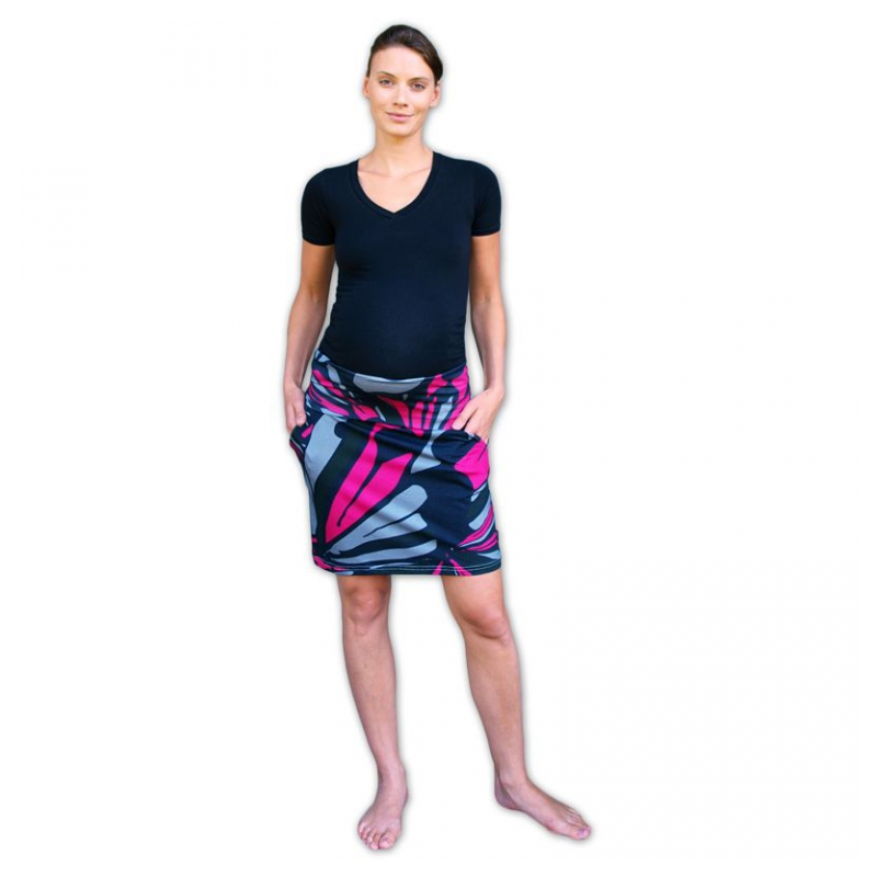 Těhotenská sukně s kapsami SIMONA- vzorovaná těhotenská sukně, kterou využijete i po porodu. Je ušita z bavlněného úpletu s 6-8% příměsí elastanu. Sukně má nahoře vysoký úpletový pás ( 2-vrstvý ), který můžete natáhnout nahoru přes bříško nebo ohrnout dolů pod bříško. Pás se přizpůsobí i opravdu velkému bříšku, aniž by Vás tlačil, stejně tak lze sukni nosit i bez těhotenského bříška, aniž by Vám sukně padala. Díky velké elastičnosti látky je materiál opravdu hodně přizpůsobivý. Sukně nemá nikde žádné gumy, šňůrky apod., takže je to vrchol pohodlnosti i pro citlivá bříška. :-) Sukně má jednoduchý áčkový střih, s dvěma bočními kapsami.