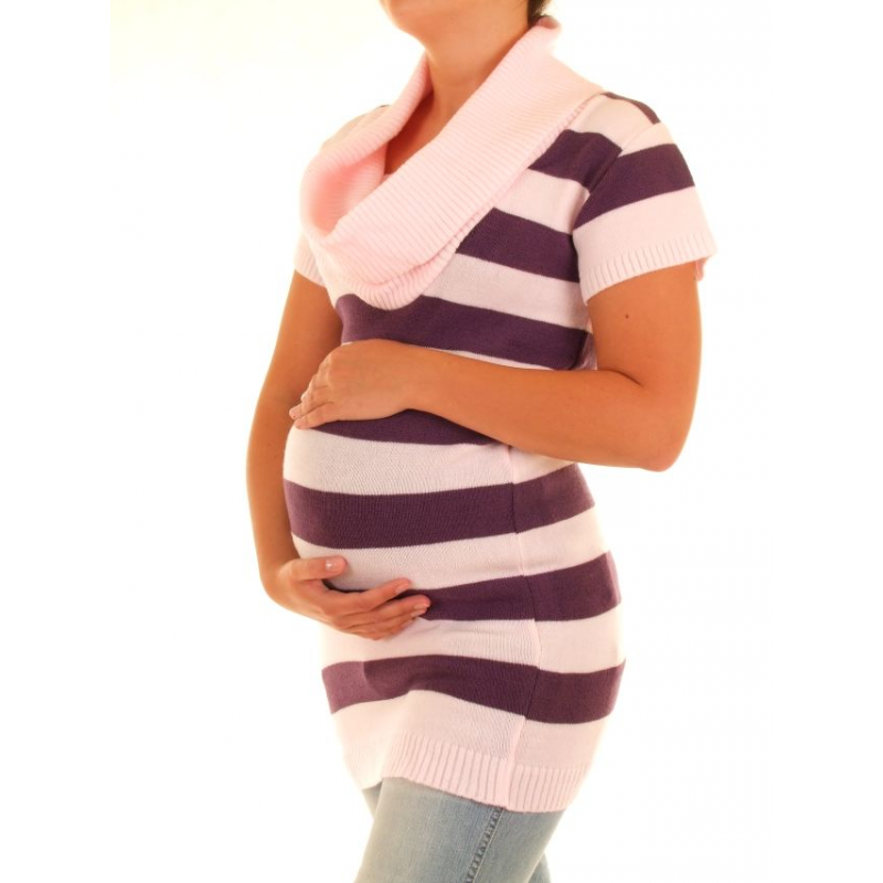 Módní pruhovaná tunika s krátkým rukávem. Volný rolák nabízí jedinečný styl a eleganci snoubené s dokonalým barevným ladění. Tunika/svetřík je velmi pružný a přizpůsobivý, proto je vhodný nejen během těhotenství, ale i po porodu.