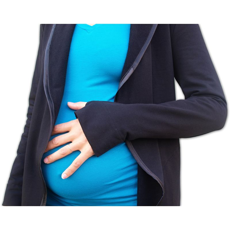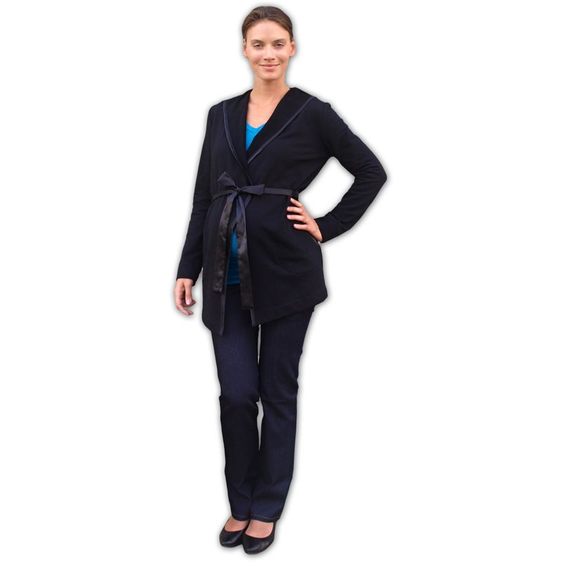 Kabátek můžete nosit buď otevřený ( přední díly olemované saténem se vlní ) nebo převázaný saténovým páskem. Kabátek nemá poutka na pásek, aby nekazily efekt rozhaleného kabátku a zároveň aby bylo možné v těhotenství jej uvázat nad bříškem a po porodu normálně v pase. V případě, kdy pásek nepotřebujete, můžete jej uschovat do kapsičky ( také lemované saténem ).